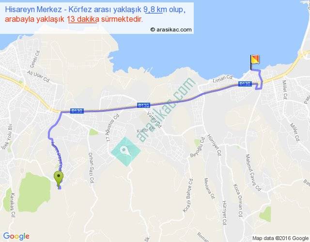 Hisareyn Merkez - Körfez arası yaklaşık olarak 90 km/h ile yukarıda belirtilen sürede olup, iki yerin kuş uçuşu uzaklığı (mesafesi) 7'dir. Yolculuk otobüsle 16 dakika sürmektedir.