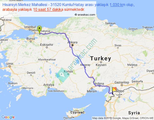 Hisareyn Merkez Mahallesi - 31520 Kumlu Hatay arası yaklaşık olarak 90 km/h ile yukarıda belirtilen sürede olup, iki yerin kuş uçuşu uzaklığı (mesafesi) 747'dir. Eğer belirtilen yerler arasında uçak seferi var ise bu süre uçakla 1 saat 08 dakika'ya kadar düşebilir. Yolculuk otobüsle 14 saat 14 dakika sürmektedir.