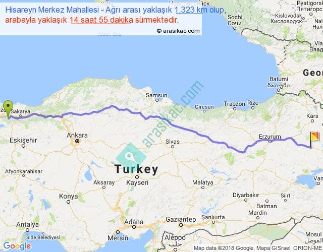 Hisareyn Merkez Mahallesi - Ağrı arası yaklaşık olarak 90 km/h ile yukarıda belirtilen sürede olup, iki yerin kuş uçuşu uzaklığı (mesafesi) 1117'dir. Eğer belirtilen yerler arasında uçak seferi var ise bu süre uçakla 1 saat 43 dakika'ya kadar düşebilir. Yolculuk otobüsle 19 saat 23 dakika sürmektedir.