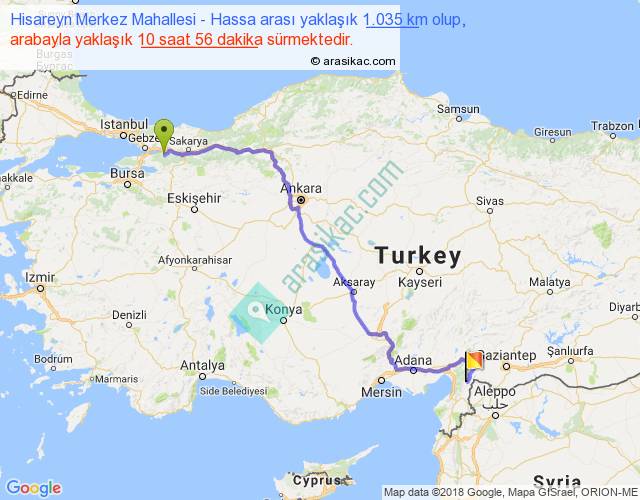 Hisareyn Merkez Mahallesi - Hassa arası yaklaşık olarak 90 km/h ile yukarıda belirtilen sürede olup, iki yerin kuş uçuşu uzaklığı (mesafesi) 716'dir. Eğer belirtilen yerler arasında uçak seferi var ise bu süre uçakla 1 saat 06 dakika'ya kadar düşebilir. Yolculuk otobüsle 14 saat 12 dakika sürmektedir.