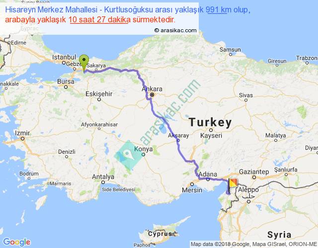 Hisareyn Merkez Mahallesi - Kurtlusoğuksu arası yaklaşık olarak 90 km/h ile yukarıda belirtilen sürede olup, iki yerin kuş uçuşu uzaklığı (mesafesi) 724'dir. Eğer belirtilen yerler arasında uçak seferi var ise bu süre uçakla 1 saat 06 dakika'ya kadar düşebilir. Yolculuk otobüsle 13 saat 35 dakika sürmektedir.
