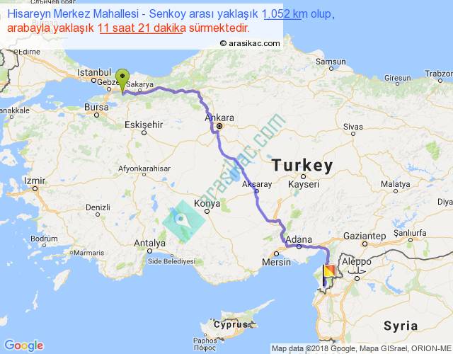 Hisareyn Merkez Mahallesi - Senkoy arası yaklaşık olarak 90 km/h ile yukarıda belirtilen sürede olup, iki yerin kuş uçuşu uzaklığı (mesafesi) 748'dir. Eğer belirtilen yerler arasında uçak seferi var ise bu süre uçakla 1 saat 09 dakika'ya kadar düşebilir. Yolculuk otobüsle 14 saat 45 dakika sürmektedir.