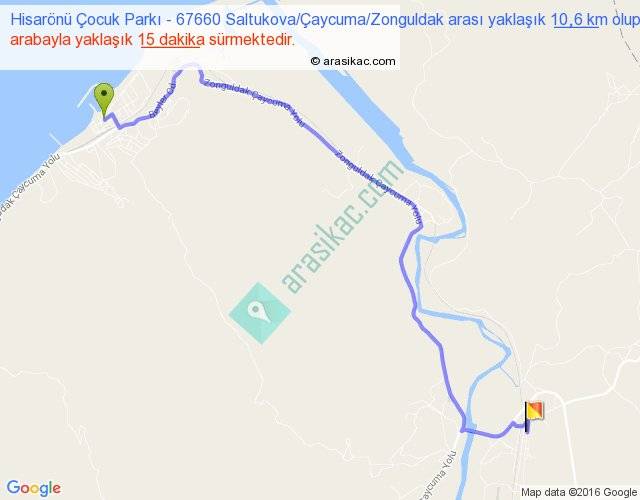 Hisarönü Çocuk Parkı - 67660 Saltukova Çaycuma Zonguldak arası yaklaşık olarak 90 km/h ile yukarıda belirtilen sürede olup, iki yerin kuş uçuşu uzaklığı (mesafesi) 7'dir. Yolculuk otobüsle 19 dakika sürmektedir.