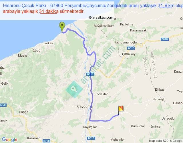 Hisarönü Çocuk Parkı - 67960 Perşembe Çaycuma Zonguldak arası yaklaşık olarak 90 km/h ile yukarıda belirtilen sürede olup, iki yerin kuş uçuşu uzaklığı (mesafesi) 20'dir. Yolculuk otobüsle 40 dakika sürmektedir.