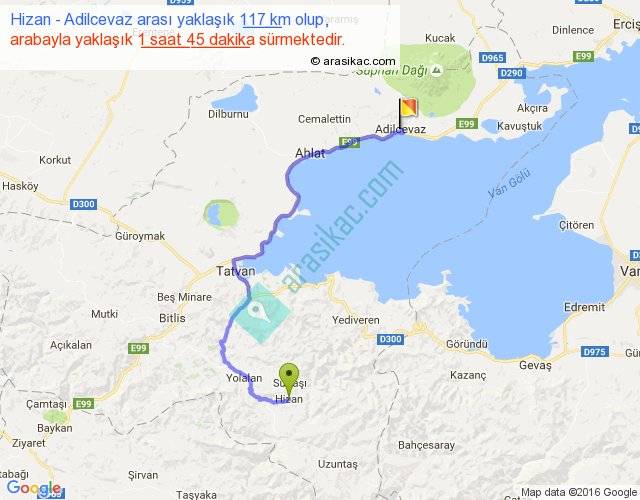 Hizan - Adilcevaz arası yaklaşık olarak 90 km/h ile yukarıda belirtilen sürede olup, iki yerin kuş uçuşu uzaklığı (mesafesi) 69'dir. Yolculuk otobüsle 2 saat 16 dakika sürmektedir.