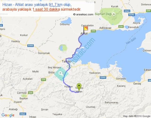 Hizan - Ahlat arası yaklaşık olarak 90 km/h ile yukarıda belirtilen sürede olup, iki yerin kuş uçuşu uzaklığı (mesafesi) 59'dir. Yolculuk otobüsle 1 saat 57 dakika sürmektedir.