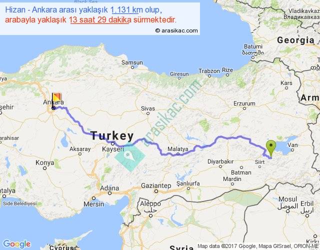 Hizan - Ankara arası yaklaşık olarak 90 km/h ile yukarıda belirtilen sürede olup, iki yerin kuş uçuşu uzaklığı (mesafesi) 842'dir. Eğer belirtilen yerler arasında uçak seferi var ise bu süre uçakla 1 saat 17 dakika'ya kadar düşebilir. Yolculuk otobüsle 17 saat 31 dakika sürmektedir.