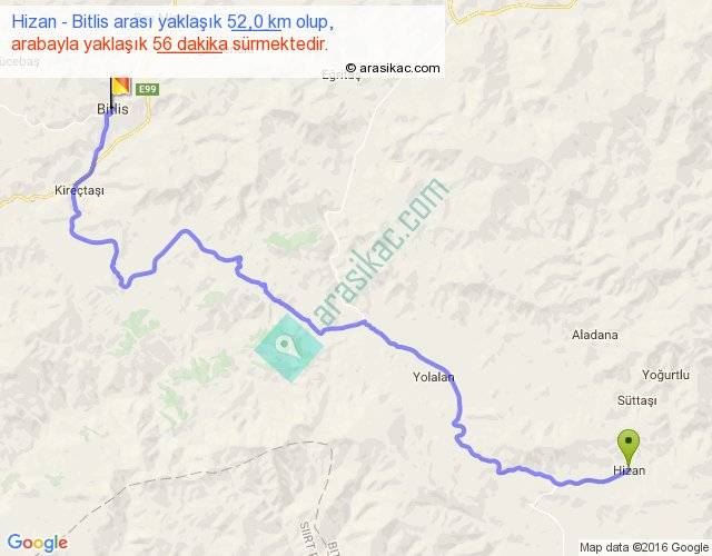 Hizan - Bitlis arası yaklaşık olarak 90 km/h ile yukarıda belirtilen sürede olup, iki yerin kuş uçuşu uzaklığı (mesafesi) 34'dir. Yolculuk otobüsle 1 saat 12 dakika sürmektedir.