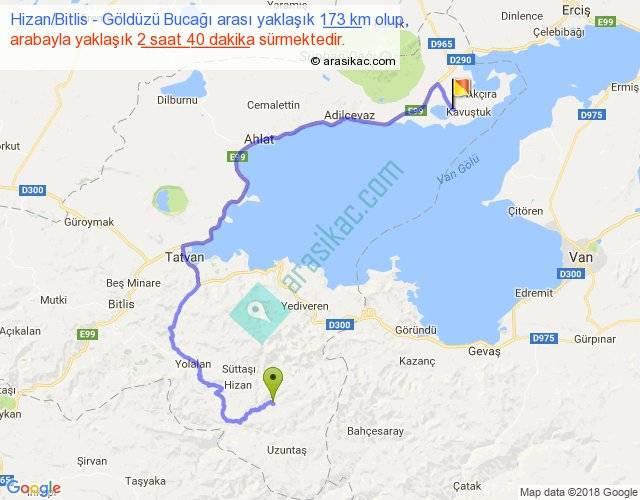 Hizan Bitlis - Göldüzü Bucağı arası yaklaşık olarak 90 km/h ile yukarıda belirtilen sürede olup, iki yerin kuş uçuşu uzaklığı (mesafesi) 82'dir. Yolculuk otobüsle 3 saat 28 dakika sürmektedir.