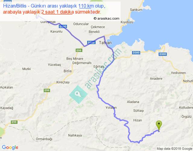 Hizan Bitlis - Günkırı arası yaklaşık olarak 90 km/h ile yukarıda belirtilen sürede olup, iki yerin kuş uçuşu uzaklığı (mesafesi) 66'dir. Yolculuk otobüsle 2 saat 37 dakika sürmektedir.