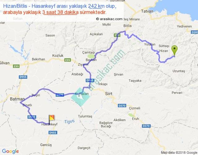Hizan Bitlis - Hasankeyf arası yaklaşık olarak 90 km/h ile yukarıda belirtilen sürede olup, iki yerin kuş uçuşu uzaklığı (mesafesi) 110'dir. Yolculuk otobüsle 4 saat 43 dakika sürmektedir.