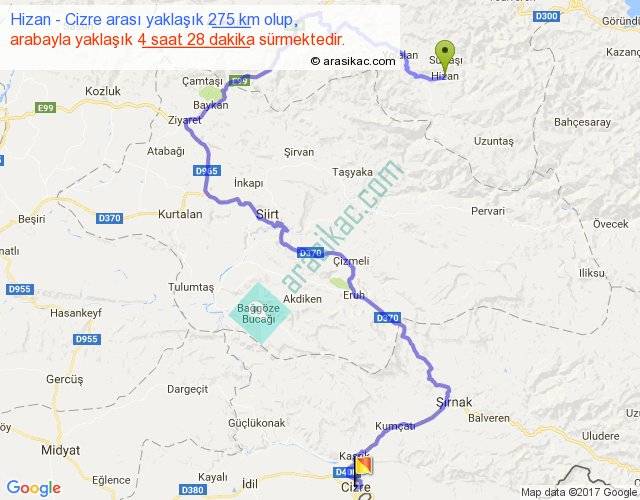 Hizan - Cizre arası yaklaşık olarak 90 km/h ile yukarıda belirtilen sürede olup, iki yerin kuş uçuşu uzaklığı (mesafesi) 101'dir. Yolculuk otobüsle 5 saat 48 dakika sürmektedir.