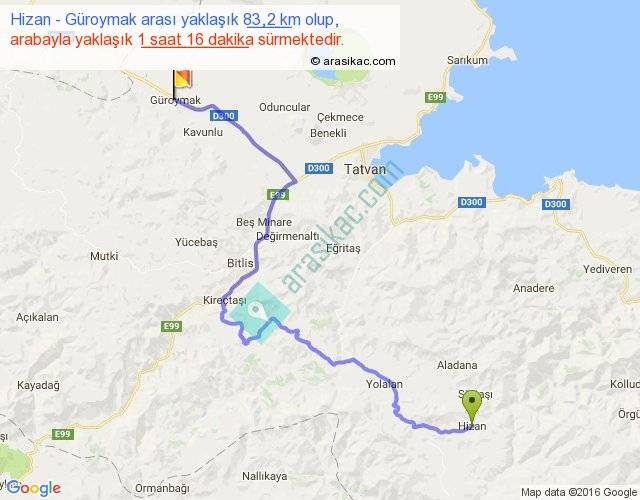 Hizan - Güroymak arası yaklaşık olarak 90 km/h ile yukarıda belirtilen sürede olup, iki yerin kuş uçuşu uzaklığı (mesafesi) 52'dir. Yolculuk otobüsle 1 saat 38 dakika sürmektedir.