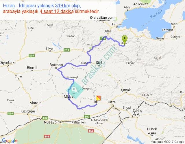 Hizan - İdil arası yaklaşık olarak 90 km/h ile yukarıda belirtilen sürede olup, iki yerin kuş uçuşu uzaklığı (mesafesi) 108'dir. Yolculuk otobüsle 5 saat 27 dakika sürmektedir.