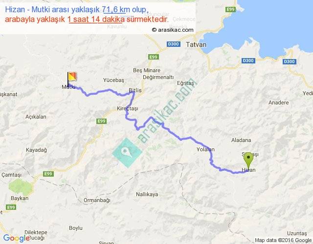 Hizan - Mutki arası yaklaşık olarak 90 km/h ile yukarıda belirtilen sürede olup, iki yerin kuş uçuşu uzaklığı (mesafesi) 48'dir. Yolculuk otobüsle 1 saat 36 dakika sürmektedir.