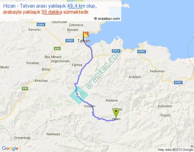 Hizan - Tatvan arası yaklaşık olarak 90 km/h ile yukarıda belirtilen sürede olup, iki yerin kuş uçuşu uzaklığı (mesafesi) 33'dir. Yolculuk otobüsle 1 saat 11 dakika sürmektedir.