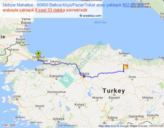 Hobyar Mahallesi - 60800 Ballıca Köyü Pazar Tokat arası yaklaşık olarak 90 km/h ile yukarıda belirtilen sürede olup, iki yerin kuş uçuşu uzaklığı (mesafesi) 621'dir. Eğer belirtilen yerler arasında uçak seferi var ise bu süre uçakla 57 dakika'ya kadar düşebilir. Yolculuk otobüsle 11 saat 32 dakika sürmektedir.