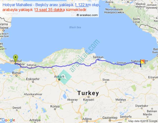 Hobyar Mahallesi - Beşköy arası yaklaşık olarak 90 km/h ile yukarıda belirtilen sürede olup, iki yerin kuş uçuşu uzaklığı (mesafesi) 931'dir. Eğer belirtilen yerler arasında uçak seferi var ise bu süre uçakla 1 saat 25 dakika'ya kadar düşebilir. Yolculuk otobüsle 17 saat 39 dakika sürmektedir.