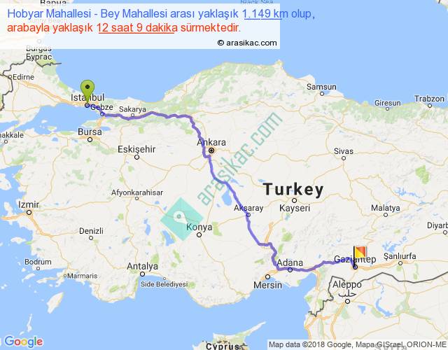 Hobyar Mahallesi - Bey Mahallesi arası yaklaşık olarak 90 km/h ile yukarıda belirtilen sürede olup, iki yerin kuş uçuşu uzaklığı (mesafesi) 843'dir. Eğer belirtilen yerler arasında uçak seferi var ise bu süre uçakla 1 saat 17 dakika'ya kadar düşebilir. Yolculuk otobüsle 15 saat 47 dakika sürmektedir.