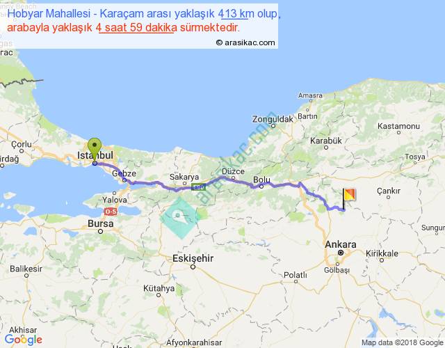 Hobyar Mahallesi - Karaçam arası yaklaşık olarak 90 km/h ile yukarıda belirtilen sürede olup, iki yerin kuş uçuşu uzaklığı (mesafesi) 336'dir. Eğer belirtilen yerler arasında uçak seferi var ise bu süre uçakla 31 dakika'ya kadar düşebilir. Yolculuk otobüsle 6 saat 28 dakika sürmektedir.
