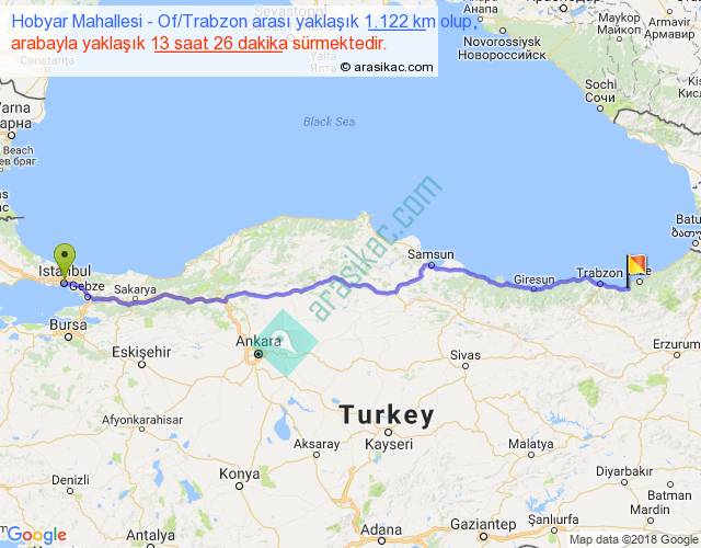 Hobyar Mahallesi - Of Trabzon arası yaklaşık olarak 90 km/h ile yukarıda belirtilen sürede olup, iki yerin kuş uçuşu uzaklığı (mesafesi) 944'dir. Eğer belirtilen yerler arasında uçak seferi var ise bu süre uçakla 1 saat 27 dakika'ya kadar düşebilir. Yolculuk otobüsle 17 saat 27 dakika sürmektedir.