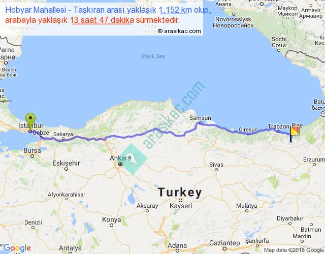 Hobyar Mahallesi - Taşkıran arası yaklaşık olarak 90 km/h ile yukarıda belirtilen sürede olup, iki yerin kuş uçuşu uzaklığı (mesafesi) 944'dir. Eğer belirtilen yerler arasında uçak seferi var ise bu süre uçakla 1 saat 27 dakika'ya kadar düşebilir. Yolculuk otobüsle 17 saat 55 dakika sürmektedir.