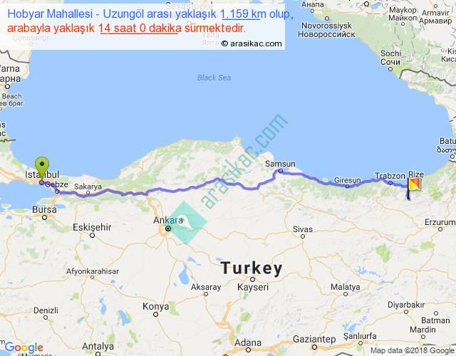 Hobyar Mahallesi - Uzungöl arası yaklaşık olarak 90 km/h ile yukarıda belirtilen sürede olup, iki yerin kuş uçuşu uzaklığı (mesafesi) 947'dir. Eğer belirtilen yerler arasında uçak seferi var ise bu süre uçakla 1 saat 27 dakika'ya kadar düşebilir. Yolculuk otobüsle 18 saat 12 dakika sürmektedir.