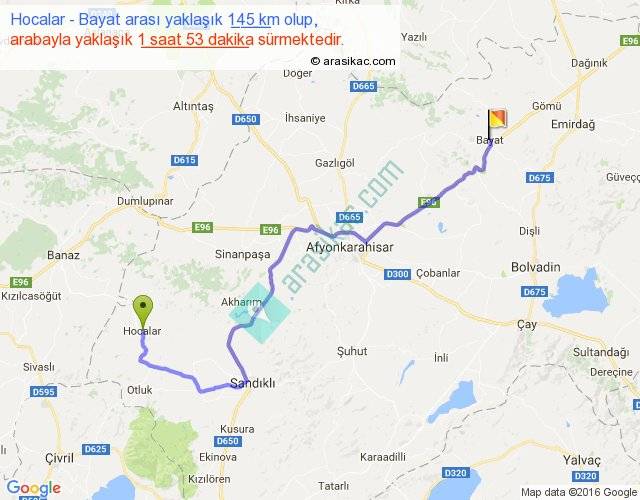 Hocalar - Bayat arası yaklaşık olarak 90 km/h ile yukarıda belirtilen sürede olup, iki yerin kuş uçuşu uzaklığı (mesafesi) 94'dir. Yolculuk otobüsle 2 saat 26 dakika sürmektedir.
