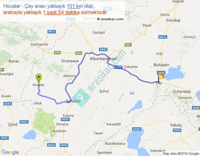 Hocalar - Çay arası yaklaşık olarak 90 km/h ile yukarıda belirtilen sürede olup, iki yerin kuş uçuşu uzaklığı (mesafesi) 91'dir. Yolculuk otobüsle 2 saat 28 dakika sürmektedir.