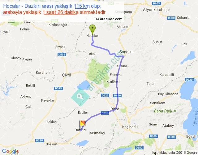 Hocalar - Dazkırı arası yaklaşık olarak 90 km/h ile yukarıda belirtilen sürede olup, iki yerin kuş uçuşu uzaklığı (mesafesi) 73'dir. Yolculuk otobüsle 1 saat 51 dakika sürmektedir.