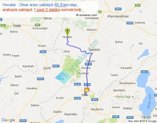 Hocalar - Dinar arası yaklaşık olarak 90 km/h ile yukarıda belirtilen sürede olup, iki yerin kuş uçuşu uzaklığı (mesafesi) 59'dir. Yolculuk otobüsle 1 saat 20 dakika sürmektedir.