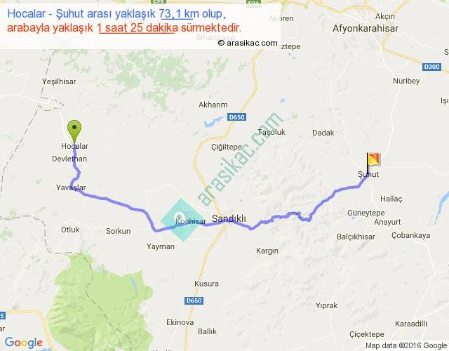 Hocalar - Şuhut arası yaklaşık olarak 90 km/h ile yukarıda belirtilen sürede olup, iki yerin kuş uçuşu uzaklığı (mesafesi) 50'dir. Yolculuk otobüsle 1 saat 50 dakika sürmektedir.