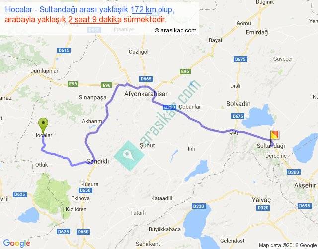 Hocalar - Sultandağı arası yaklaşık olarak 90 km/h ile yukarıda belirtilen sürede olup, iki yerin kuş uçuşu uzaklığı (mesafesi) 109'dir. Yolculuk otobüsle 2 saat 47 dakika sürmektedir.