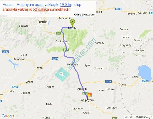 Honaz - Acıpayam arası yaklaşık olarak 90 km/h ile yukarıda belirtilen sürede olup, iki yerin kuş uçuşu uzaklığı (mesafesi) 37'dir. Yolculuk otobüsle 1 saat 7 dakika sürmektedir.