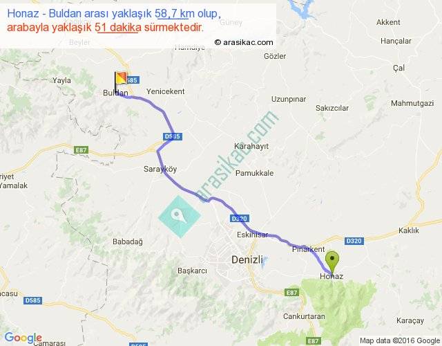 Honaz - Buldan arası yaklaşık olarak 90 km/h ile yukarıda belirtilen sürede olup, iki yerin kuş uçuşu uzaklığı (mesafesi) 49'dir. Yolculuk otobüsle 1 saat 6 dakika sürmektedir.