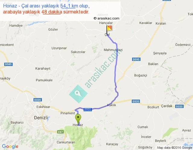 Honaz - Çal arası yaklaşık olarak 90 km/h ile yukarıda belirtilen sürede olup, iki yerin kuş uçuşu uzaklığı (mesafesi) 38'dir. Yolculuk otobüsle 1 saat 2 dakika sürmektedir.