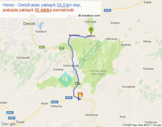 Honaz - Denizli arası yaklaşık olarak 90 km/h ile yukarıda belirtilen sürede olup, iki yerin kuş uçuşu uzaklığı (mesafesi) 15'dir. Yolculuk otobüsle 45 dakika sürmektedir.