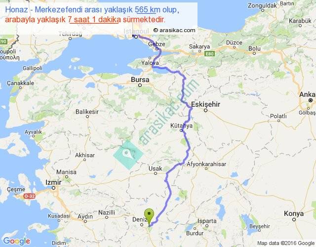 Honaz - Merkezefendi arası yaklaşık olarak 90 km/h ile yukarıda belirtilen sürede olup, iki yerin kuş uçuşu uzaklığı (mesafesi) 361'dir. Eğer belirtilen yerler arasında uçak seferi var ise bu süre uçakla 33 dakika'ya kadar düşebilir. Yolculuk otobüsle 9 saat 7 dakika sürmektedir.