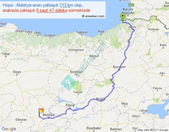 Hopa - Malatya arası yaklaşık olarak 90 km/h ile yukarıda belirtilen sürede olup, iki yerin kuş uçuşu uzaklığı (mesafesi) 443'dir. Eğer belirtilen yerler arasında uçak seferi var ise bu süre uçakla 40 dakika'ya kadar düşebilir. Yolculuk otobüsle 12 saat 43 dakika sürmektedir.