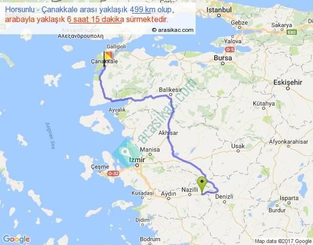 Horsunlu - Çanakkale arası yaklaşık olarak 90 km/h ile yukarıda belirtilen sürede olup, iki yerin kuş uçuşu uzaklığı (mesafesi) 310'dir. Eğer belirtilen yerler arasında uçak seferi var ise bu süre uçakla 28 dakika'ya kadar düşebilir. Yolculuk otobüsle 8 saat 7 dakika sürmektedir.