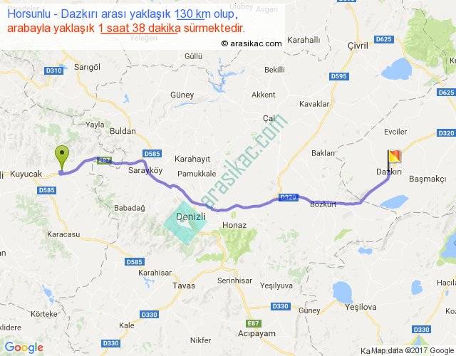 Horsunlu - Dazkırı arası yaklaşık olarak 90 km/h ile yukarıda belirtilen sürede olup, iki yerin kuş uçuşu uzaklığı (mesafesi) 110'dir. Yolculuk otobüsle 2 saat 7 dakika sürmektedir.