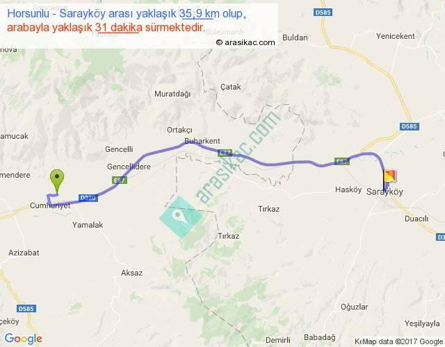 Horsunlu - Sarayköy arası yaklaşık olarak 90 km/h ile yukarıda belirtilen sürede olup, iki yerin kuş uçuşu uzaklığı (mesafesi) 28'dir. Yolculuk otobüsle 40 dakika sürmektedir.