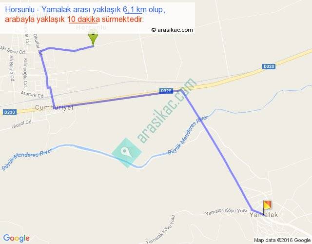 Horsunlu - Yamalak arası yaklaşık olarak 90 km/h ile yukarıda belirtilen sürede olup, iki yerin kuş uçuşu uzaklığı (mesafesi) 4'dir. Yolculuk otobüsle 13 dakika sürmektedir.