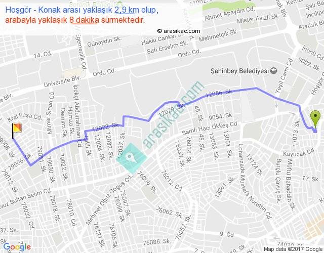 Hoşgör - Konak arası yaklaşık olarak 90 km/h ile yukarıda belirtilen sürede olup, iki yerin kuş uçuşu uzaklığı (mesafesi) 2'dir. Yolculuk otobüsle 10 dakika sürmektedir.