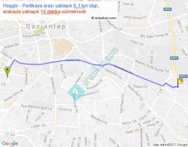Hoşgör - Perilikaya arası yaklaşık olarak 90 km/h ile yukarıda belirtilen sürede olup, iki yerin kuş uçuşu uzaklığı (mesafesi) 4'dir. Yolculuk otobüsle 18 dakika sürmektedir.