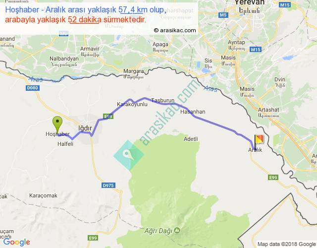 Hoşhaber - Aralık arası yaklaşık olarak 90 km/h ile yukarıda belirtilen sürede olup, iki yerin kuş uçuşu uzaklığı (mesafesi) 47'dir. Yolculuk otobüsle 1 saat 7 dakika sürmektedir.