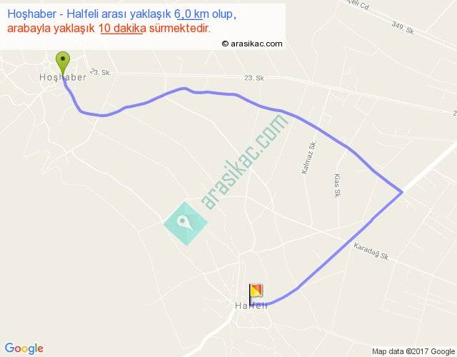 Hoşhaber - Halfeli arası yaklaşık olarak 90 km/h ile yukarıda belirtilen sürede olup, iki yerin kuş uçuşu uzaklığı (mesafesi) 3'dir. Yolculuk otobüsle 13 dakika sürmektedir.