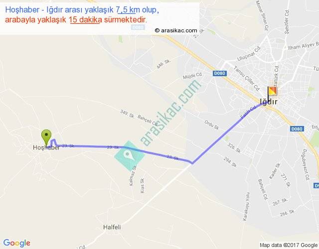 Hoşhaber - Iğdır arası yaklaşık olarak 90 km/h ile yukarıda belirtilen sürede olup, iki yerin kuş uçuşu uzaklığı (mesafesi) 7'dir. Yolculuk otobüsle 19 dakika sürmektedir.