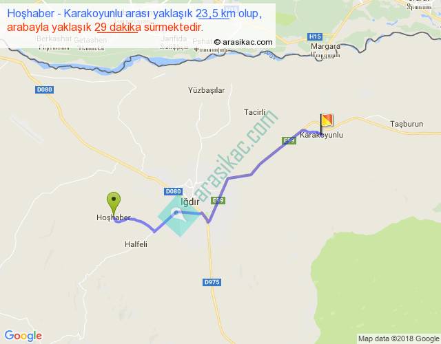 Hoşhaber - Karakoyunlu arası yaklaşık olarak 90 km/h ile yukarıda belirtilen sürede olup, iki yerin kuş uçuşu uzaklığı (mesafesi) 19'dir. Yolculuk otobüsle 37 dakika sürmektedir.