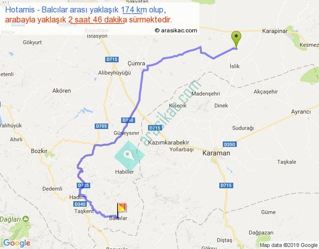 Hotamis - Balcılar arası yaklaşık olarak 90 km/h ile yukarıda belirtilen sürede olup, iki yerin kuş uçuşu uzaklığı (mesafesi) 100'dir. Yolculuk otobüsle 3 saat 35 dakika sürmektedir.